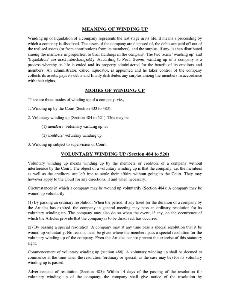Voluntary winding up may take place either by passing of a special resolution or by passing an ordinary resolution by the members as a result of expiry of its time period as fixed by the articles of association or the completion of the project or event for which it was constituted. Voluntary winding up by memberpursuant to section 254 of the act, a member's voluntary winding up can only take place where the company is solvent. In this case, it is not necessary for the members to consult the creditors or to call their meeting. The limited liability partnership, through its partners may decide. A members' voluntary winding up usually does not involve the creditors, because the company is still in a position to pay its creditors in full. Its sole purpose is to sell off assets, pay off creditors, and distribute any remaining assets. In a members' voluntary winding up, the liquidation takes place under the control of a liquidator appointed by the shareholders, and only in cases where. The member's voluntary winding up will be resolved by a special resolution in general meeting. On order of dissolution passed by nclt file order to roc and co wound up. Voluntary winding up of companies. For other uses, see liquidation (disambiguation). Catherine grima | 18 jul 2013. The effect of the winding up order is that the business of the company is terminated and all the affairs of the winding up company shall be governed by a liquidator.