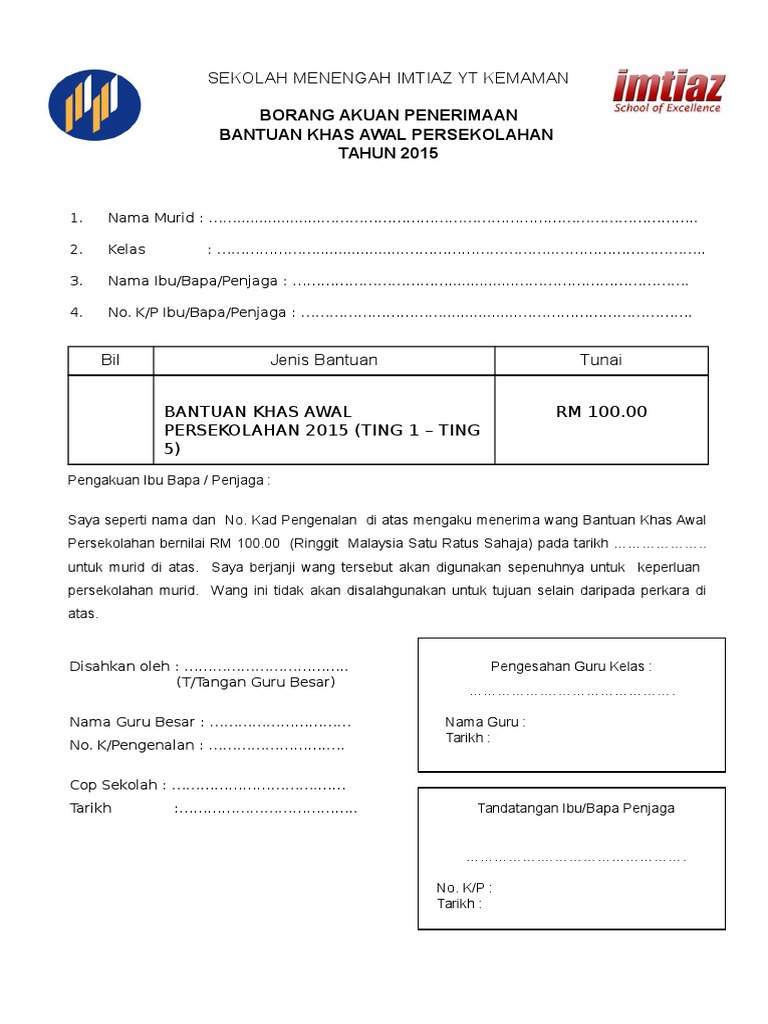 Tidak cukup dengan itu, ada lagi bantuan persekolahan. Bantuan awal persekolahan bap 2020 bernilai rm100 bagi setiap seorang murid atau pelajar akan disalurkan kepada kementerian pendidikan malaysia kpm untuk diagihkan kepada 32 juta pelajar tahun satu hingga tingkatan lima lampiran b borang akuan penerimaan bantuan rm 100 00 docx docx. Kpm akan membuat pembayaran seawal 4 januari tahun semasa secara berperingkat terus. Sk datuk akhir zaman alamat sekolah : 71200 rantau,negeri garis panduan bantuan khas awal persekolahan rm100 kepada murid.